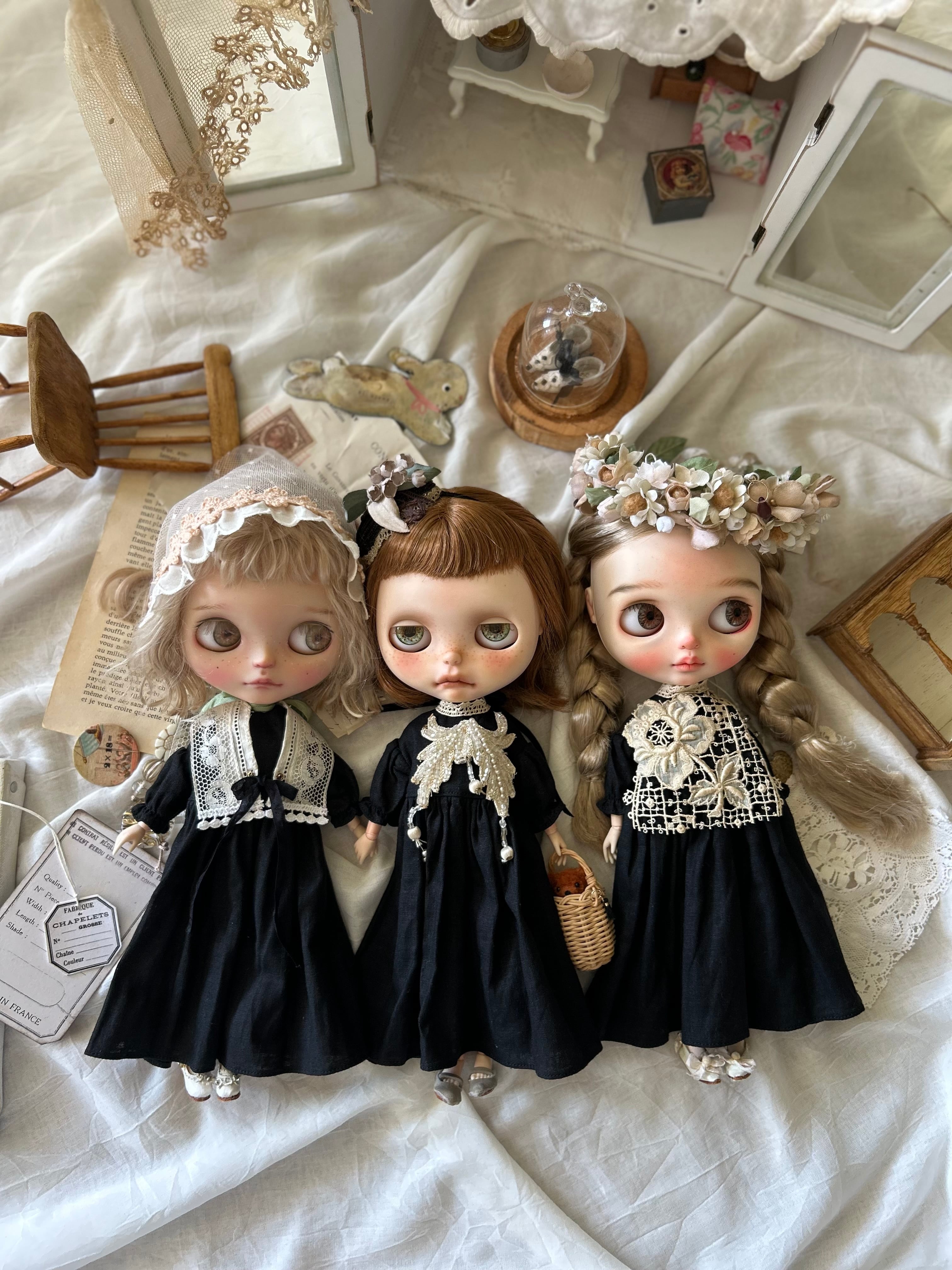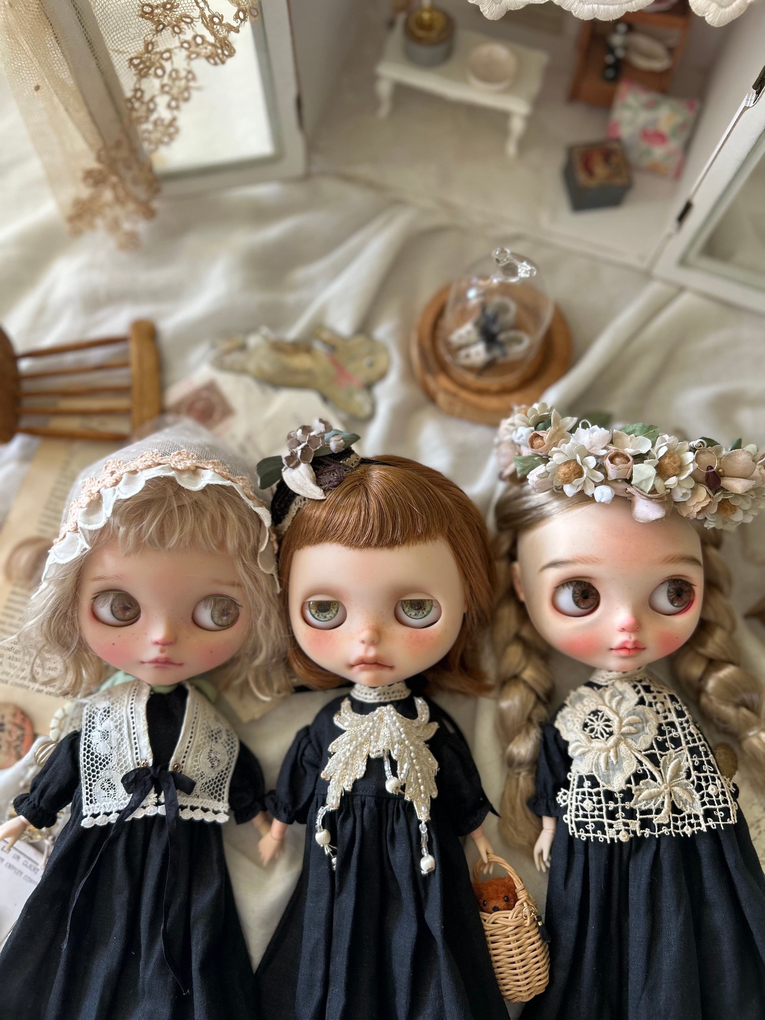 ワンピースにアンティークレースのモチーフが縫い付けてあります