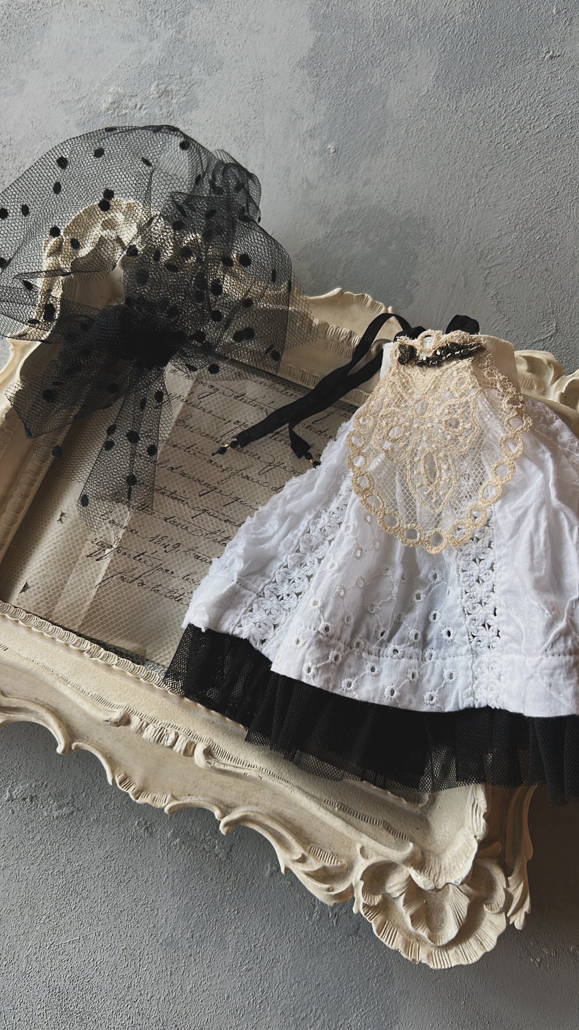 複数のデザインの違う布を縫い合わせパッチワークのような生地にたっぷりギャザーを寄せ、裾にはチュールレースをつけました