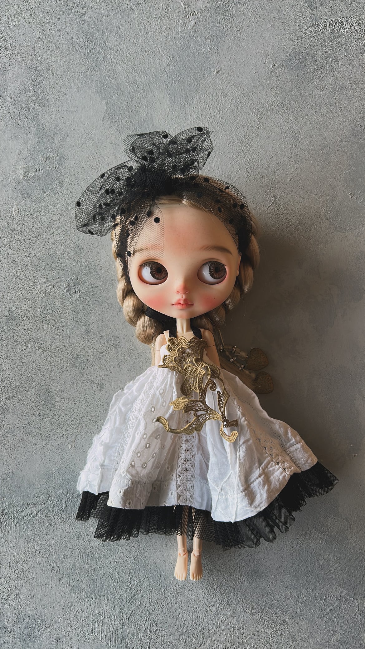 胸元にはアンティークレースやモチーフを使用しております