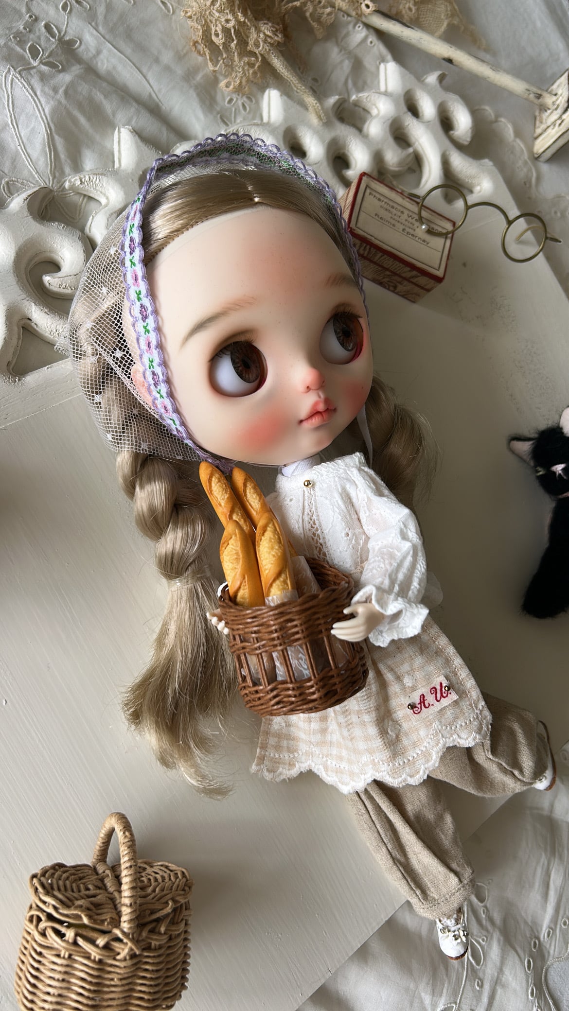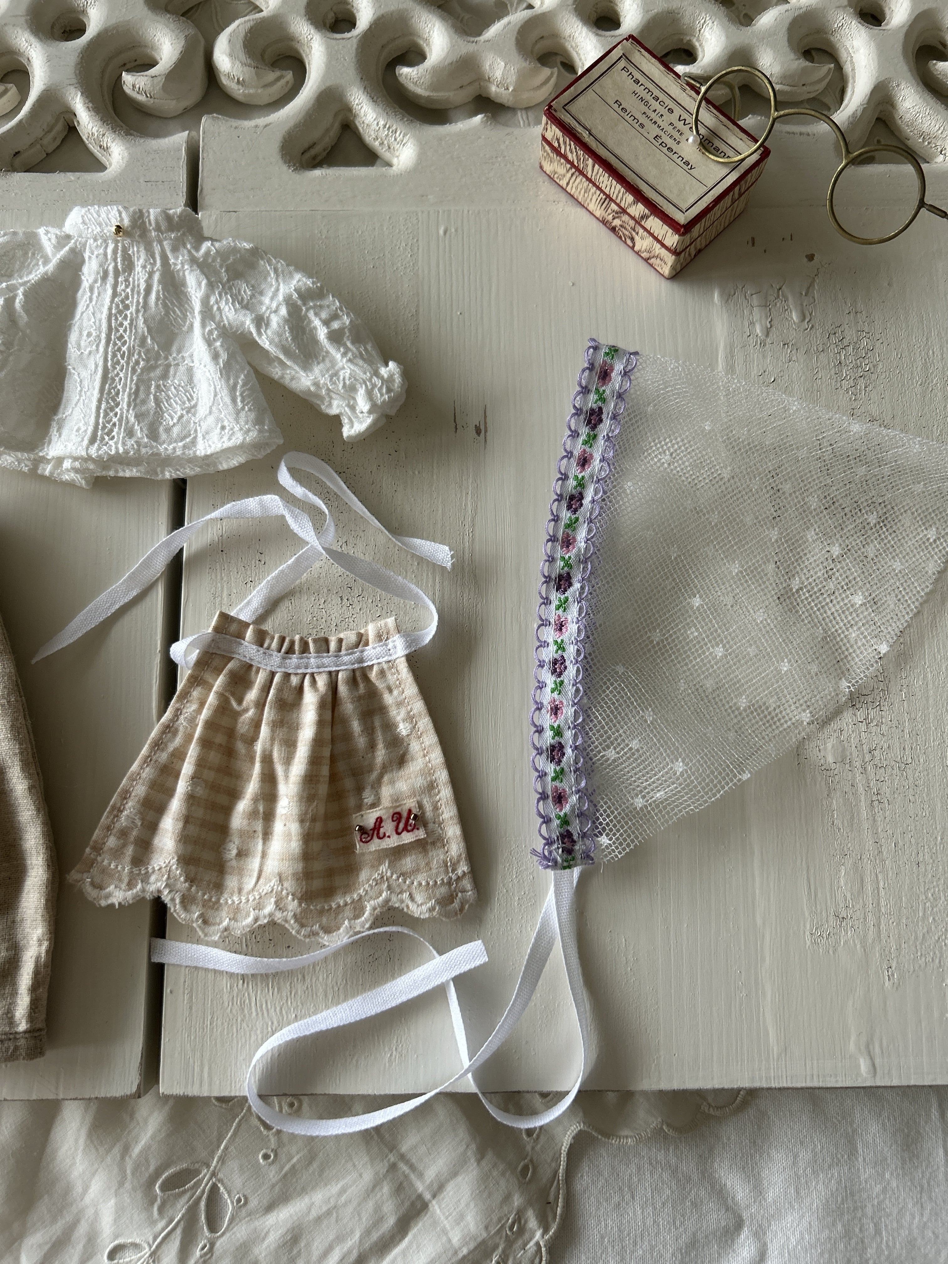 ナチュラルカラーのギンガムチェックのエプロンにアンティークイニシャルを縫い付けました