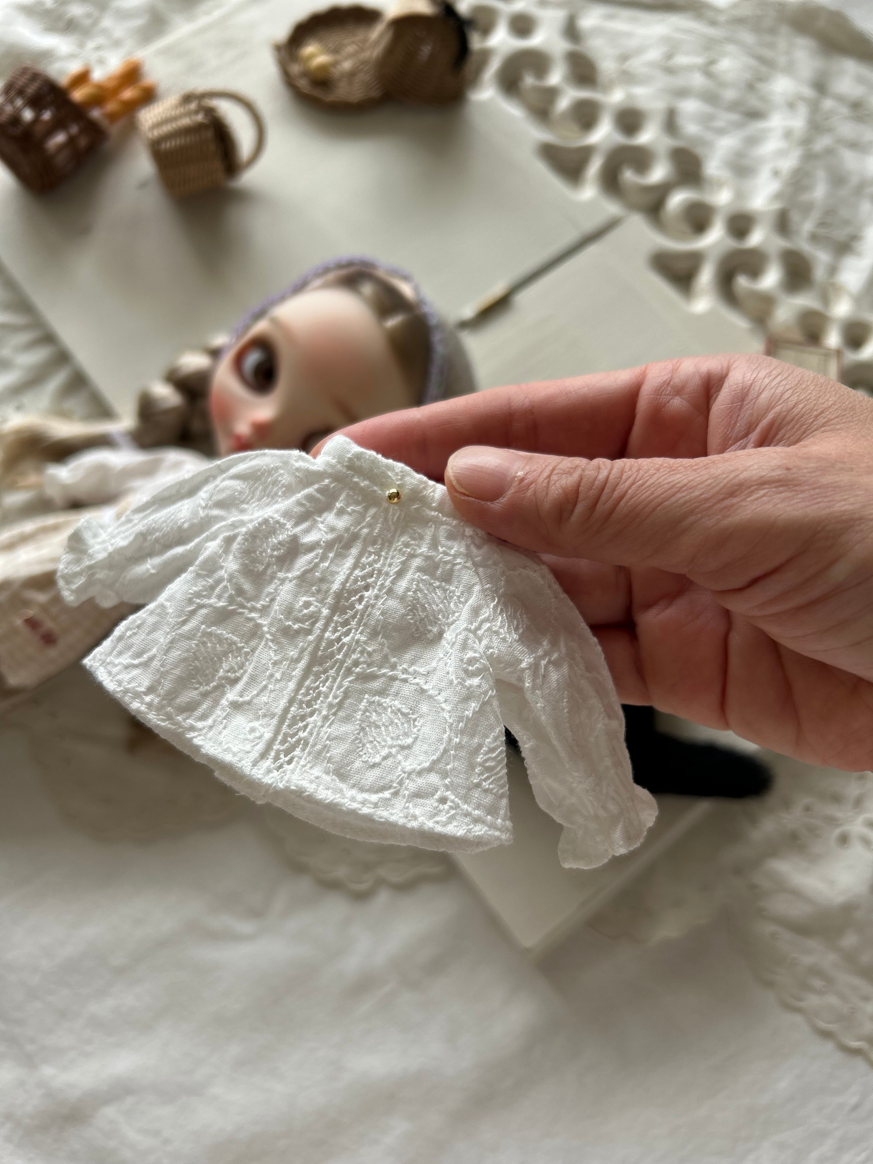 ブラウスはハートの刺繍の入った生地を使用